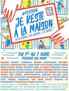 Pour assister à cette série de concerts en live de chez soi, il suffira de se rendre sur la page Facebook de l’événement #festivaljerestealamaison. Cette page donne la programmation et les horaires des sets de ce premier festival virtuel organisé en « mode confinement ». Dans cette période critique pour beaucoup de secteurs dont la filière musicale, les organisateurs entendent « faire la fête à distance en gardant espoir et énergie tout en rappelant qu’il faut rester chez soi. » Le public pourra pendant sept jours, de 16h à 22h30, visionner en direct des concerts d’une trentaine de minutes.