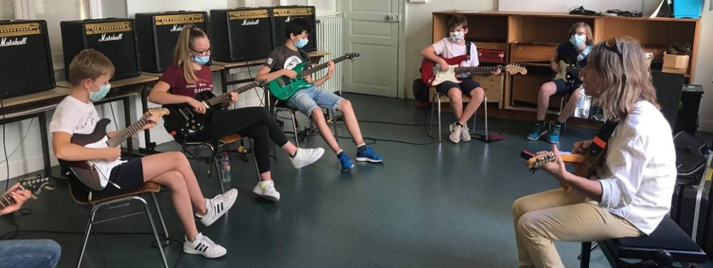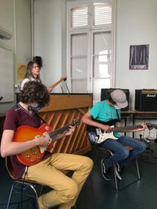 Lorsque la répétition commence, les notes et les accords s’élèvent, offrant un agréable spectacle. À cela s’ajoute le mélange visuel des guitares multicolores, de quoi stimuler les sens. « Quand tu décroches, ce n’est pas grave, mais essaie de te remettre dans le tempo », conseille Olivier aux stagiaires.
