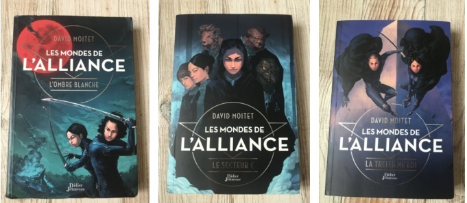 « Les Mondes de l’Alliance », de David Moitet, trilogie publiée aux éditions Didier Jeunesse. Tome 1, L’Ombre Blanche (256 pages), tome 2, Le Secteur C (288 pages), tome 3, La Treizième Loi (320 pages).