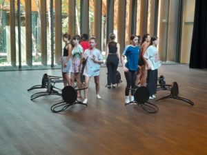 Alice Chazaud animent le stage de danse d’ART’MIX, le projet pluridisciplinaire impulsé par le service Enfance, Jeunesse et Sports du Mans, en lien avec la compagnie TDM. Neuf adolescentes prennent part aux séances qui allient modern-jazz et contemporain au petit théâtre de la Scène nationale du Mans Les Quinconces-L’Espal. Les séances se déroulent sur trois heures, en matinée, du lundi 18 au vendredi 22 juillet 2022. « Dans la première partie, nous travaillons l’échauffement, la technique, des diagonales et diverses exercices. Nous marquons une pause pour mettre aux filles de respirer et recharger les batteries « , détaille l’intervenante. Les jeunes danseuses répètent les mouvements que leur propose la chorégraphe mancelle. Malgré la chaleur, l’enthousiasme, le rythme et la concentration sont au rendez-vous.