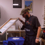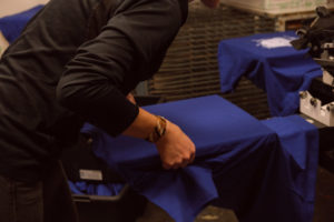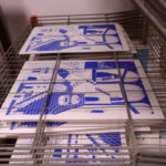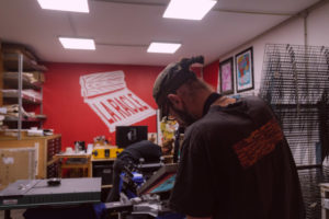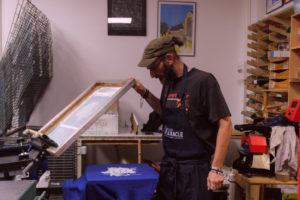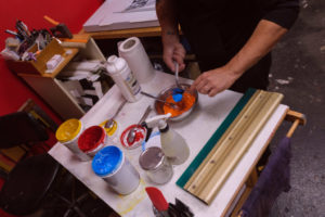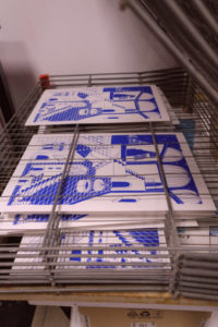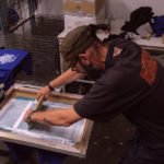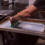 Dans le processus, le motif est dessiné à partir d’une image positive, mise sur un écran (appelée le cadre de sérigraphie). On vient ensuite appliquer, après réglage des machines, la racle pour faire passer l’encre au travers.