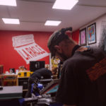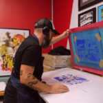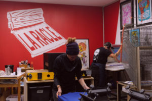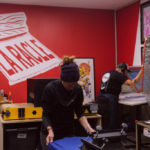 Passionnés du crayon et animés par l’envie de promouvoir les arts graphiques, Marco Porcher et Benoît, alias Barbu Graphiste, ont fondé en 2016 l’atelier La Racle – Imprimerie Sérigraphie Artisanale. Le duo a ensuite été rejoint par Claire. Basée au Hangar Créalab, au Mans, l’équipe cherche à faire découvrir le métier de sérigraphe au grand public en intervenant notamment en milieu scolaire ou sur des événements avec « Ramène ta sape »*.