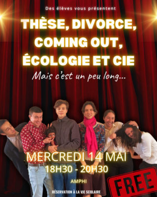 Mercredi 14 mai 2025, six élèves de Bellevue on donné une représentation de leur projet théâtral, « Thèse, divorce, coming out, écologie et cie », à l’amphithéâtre du lycée. Cette pièce d’1h30 affichait complet et le public a visiblement été conquis.