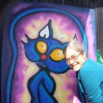 Adeline M poursuivait son chat bleu. « Mon thème d’exposition porte sur Paysages nocturnes et mondes improbables », résume l’artiste-peintre. « Je fais généralement les chats en noir. On peut observer que la queue a ce côté protecteur comme une cabane ou une écharpe. »