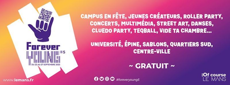 La cinquième édition du festival « Forever Young » aura lieu du mardi 23 au samedi 27 septembre 2025 dans divers lieux du Mans (centre-ville, campus universitaire, quartiers de l’Épine, des Sablons et du Sud).[…]