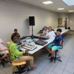 Dans la même salle des Saulnières se tenait un stage de sonorisation, encadré par Alexis Marchand, artiste habitué aux actions culturelles de la ville du Mans. Ce stage était une première pour lui. Il était proposé par le service culturel représenté par Lise, en association avec le pôle jeunesse du secteur Épine, coordonnée par Fatima Ch’hit-Hadji. Des adolescent.e.s (12 à 15 ans) se sont initié.e.s au field recording*, pratique dont l’objectif est de créer une ambiance sonore. À l’aide de machines comme le synthétiseur, le piano et la cassette, le groupe d’ados a travaillé sur six sons. Trois de ces productions seront présentées à l’évènement Forever Young sur la fête de quartier Épine, mercredi 24 septembre 2025.