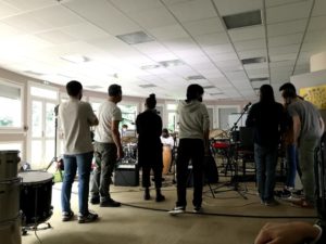 Enfin, l’atelier le plus conséquent, tant dans le nombre de participants que dans la diversité des instruments, est celui dédié à la musique. Basse, claviers, percussions en tout genre, xylophone et autres merveilles jouent en même temps. Les niveaux différent sans que cela ne pose problème. L’ensemble est calme et posé, l’ambiance franchement bonne et la communication présente. En effet, cela demande de s’écouter. Les encadrants mélangent une forme d’exigence et de bienveillance tout à fait efficace.