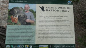 De plus, First Landing State Park a bénéficié du travail d’un spécialiste en oiseaux de proie : Reese F. Lukei. Cet expert a bénévolement aidé à l’éducation des visiteurs, ainsi qu’à l’établissement de sentiers permettant aux randonneurs d’apprécier la vue des volatiles sans les déranger. L’une des espèces les plus emblématiques du parc est le balbuzard pêcheur, que les Américains appellent « osprey ». Le parc leur sert de refuge pour former des nids et pondre dans les arbres morts de la brousse inondée. Certains couples de balbuzards, année après année, reviennent systématiquement dans le même arbre mort pour y recomposer leur nid.