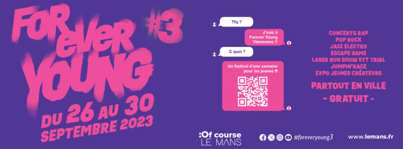 Impulsé en 2021 par le service Enfance, Jeunesse et Sports de la ville du Mans, Forever Young fait son grand retour pour une troisième édition, du mardi 26 au samedi 30 septembre 2023. Des rendez-vous culturels, sportifs, ludiques et des temps de rencontres autour de l’engagement et d’initiatives solidaires rythmeront les cinq jours de ce festival dédié à la jeunesse.