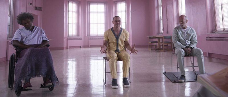 Le spectateur éprouve une sensation familière en retrouvant les trois protagonistes là où il les avait laissés : David Dunn, alias Incassable (Bruce Willis), personnage protecteur aux capacités physiques hors du commun, Elijah Price, alias M. Glass, (Samuel L. Jackson), l’homme stratège aux os de verre, et enfin, la Bête (James McAvoy) et ses 23 autres personnalités sont internés dans un hôpital psychiatrique. Ce trio de patients fait la rencontre de la psychiatre Ellie Staple, chargée d’analyser les personnes se prenant pour des super-héros. Sa mission : les étudier et les convaincre qu’ils ne sont pas surnaturels.
