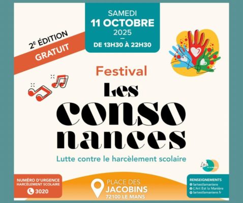 Samedi 11 octobre 2025, de 13h30 à 22h30, Festival Consonances #2, place des Jacobins, au Mans. Entrée libre. Restauration possible sur place (food-truck, bar, confiserie). Les bénéfices des consommations seront reversés à la lutte contre le harcèlement scolaire.