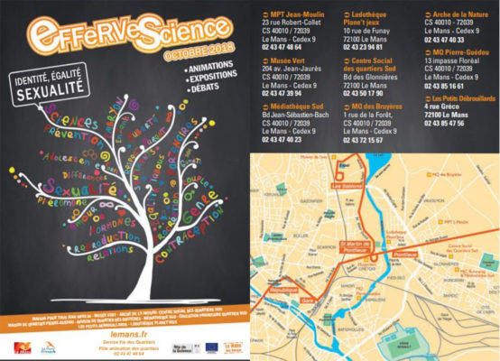L’identité, la sexualité et la reproduction constituent le fil rouge d’Effervescience 2018. Ces thématiques seront traités d’un point de vue biologique ou à travers les sciences humaines. Pendant près d’un mois, au Mans, associations et spécialistes mèneront diverses actions en direction de publics variés. Cette manifestation a pour objectif de donner des clés pour comprendre, entre autres, les mécanismes de reproduction, la « chimie de l’amour », l’identité sexuelle et du fonctionnement de son corps.