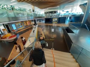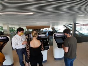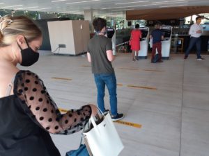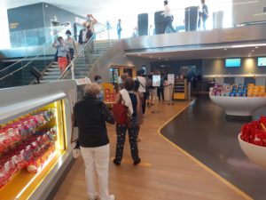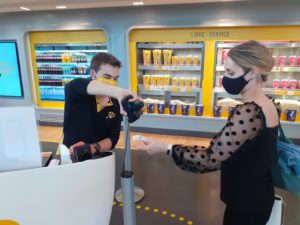 « Le Gaumont Pathé des Quinconces proposaient ses premières séances à 16h05. J’en ai profité pour aller voir De Gaulle, le biopic de Gabriel Le Bomin. En entrant dans le hall du cinéma, j’observe les marquages au sol définissant le stationnement, le sens de circulation et l’espacement d’1 mètre par personne devant les bornes d’achat. Le port du masque est obligatoire dans l’enceinte du cinéma. Monsieur Claro, le directeur et certains membres de son équipe accueillent les spectateurs et veillent au respect des normes de sécurité : explication des marquages au sol, distribution systématique de gel hydroalcoolique, sens de circulation unique, séparation des espaces dans les escaliers. L’espace confiserie est maintenue, mais des règles d’hygiène sont instaurées : port du masque et de gants en latex obligatoire pour le libre-service.