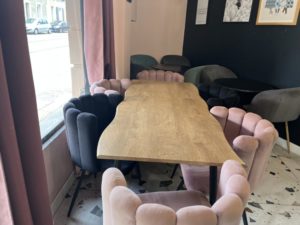 Le lieu fait aussi salon de thé. On peut s’y poser quelques minutes, avec un café et une pâtisserie. L’ambiance est simple, propre, accueillante. L’accueil est direct et chaleureux. On sent une vraie proximité avec les clients, ce qui rend l’endroit vivant.