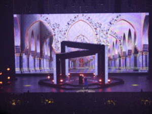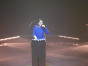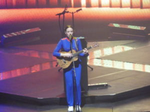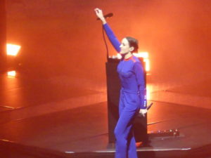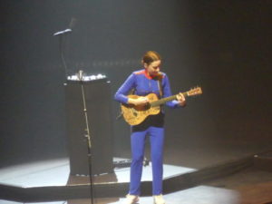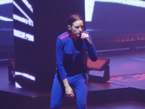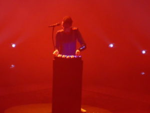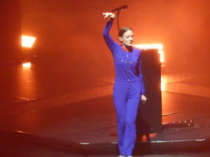 Vêtue de sa combinaison bleue, la jeune femme évolue seule aux machines. Sur plusieurs titres, elle quitte son pupitre pour parcourir la scène de long en large pour mieux communier avec les spectateurs. Pour cette tournée, la globe-trotteuse mise sur une nouvelle technologie basée sur un bracelet électronique lui permettant de lancer des sons à distance. Ce dispositif ingénieux, intégré à l’avant-bras de sa tenue, lui permet de contrôler les boucles musicales qu’elle enregistre en direct.
