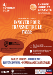 Innover pour transmettre le passé – 30 ans du Master Patrimoine et Développement local, mercredi 11 février 2026, de 8h45 à 21h00, à l’amphithéâtre Véron de Forbonnais (12-20, rue Aristophane, LE MANS), UFR Lettres, Langues et Sciences Humaines. Gratuit.
