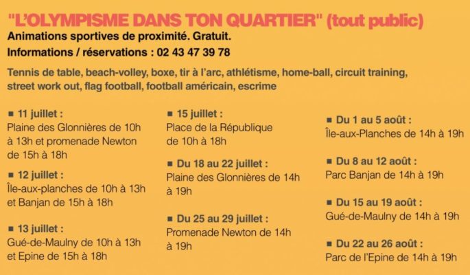 A l’approche des Jeux Olympiques de Paris 2024, le service Enfance, Jeunesse et Sports du Mans met en place le programme « L’olympisme dans ton quartier ». Cette initiative qui se déroule sur la période des vacances d’été consiste en la mise en place d’activités sportives de proximité dans les différents quartiers de la ville. Ce programme gratuit et accessible à tous a pour but d’initier le public à diverses disciplines et valoriser la pratique du sport au quotidien.