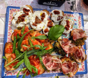Le Dimanche, les primi piatti sont plus riches: lasagnes, cannelloni, pasta al ragu (sauce bolognaise), pasta al forno (gratin de pâtes généralement à la sauce tomate)… Ils suivent les antipasti qui peuvent être composés de fromages, de charcuterie et de bruschette (pain à l’huile d’olive et accompagnés de tomates fraîches). En secondo piatto le Dimanche, on mange la carne al sugo, des boulettes de viandes accompagnées de morceaux de la viande d’agneau ou de porc mijoté dans la sauce tomate. On peut également les accompagner avec des petits légumes. Le secondo piatto n’est pas systématique en semaine. Toutefois, il peut être composé de blancs de poulet panés, fruits de mer frits ou crus, poisson, poivrons farcis ou marinés, tomates fraîches en salade accompagnées de mozzarella…
