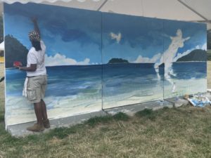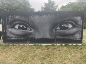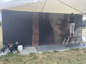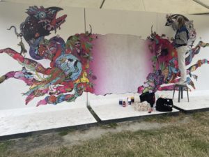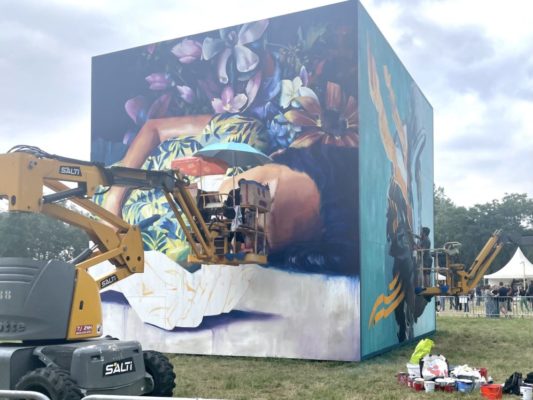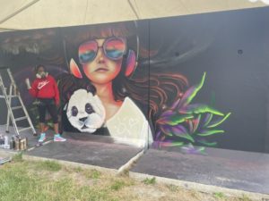 Le public a pu voir en action Doudou’Style, peintre et graffeuse venue de Martinique. L’artiste réalise une création représentant une fille et un panda, dans des couleurs vives. Sa fresque évoque les rêves et l’envie de les accomplir.