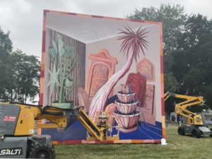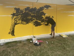 Dans un autre style, Mathieu Maignan, originaire du Mans, signe une œuvre portée sur l’impact visuel et graphique à travers les arbres. Son objectif est de faire un seul sujet, un arbre, avec différents aplats de couleurs, sur différents matériaux, avec différentes techniques. « D’habitude, je peins et j’expose dans des galeries ou des salons. C’est ma première intervention sur un festival en plein air. C’est une belle occasion pour rencontrer des passionnés,  des artistes et se faire connaitre », confie-t-il.
