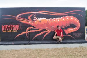 « Je dessine des personnages dans une ambiance de fête. Je travaille la peinture fluorescente afin de contraster des zones très éclatantes avec des couleurs plus sombres. Elle permet de découvrir une nouvelle fresque face à la lumière noire. » (Alice Hervé, Le Mans)