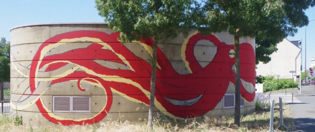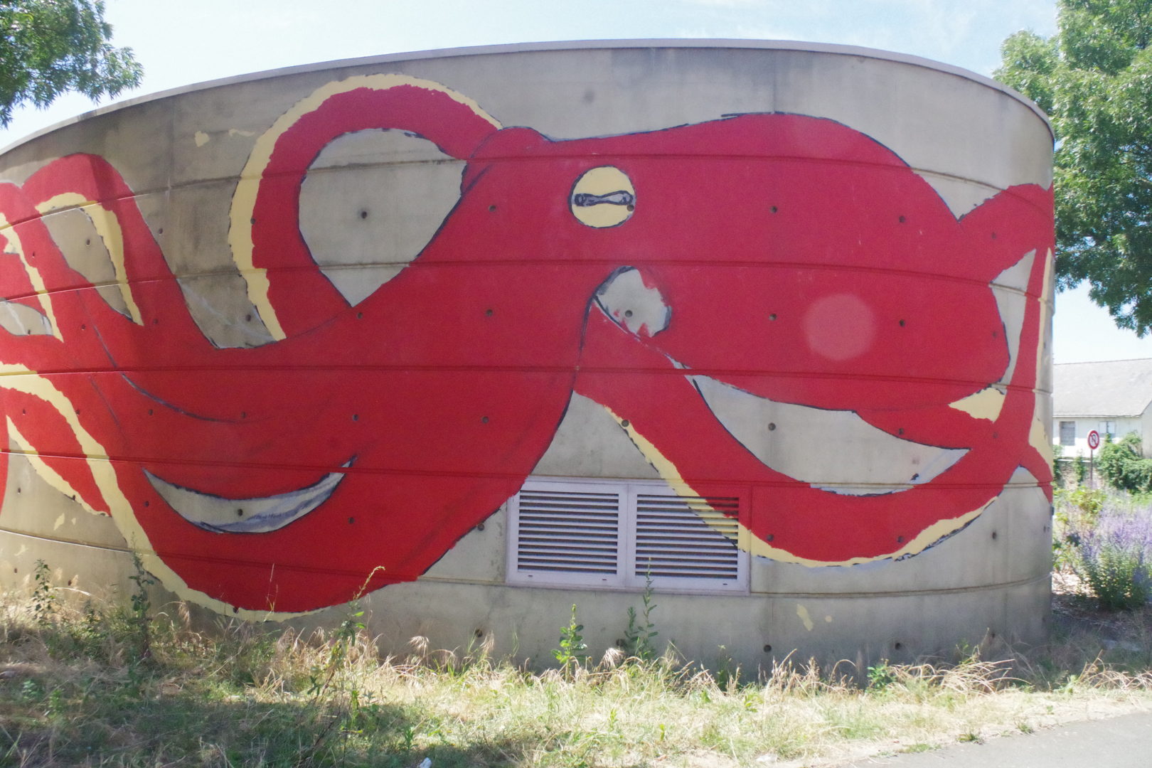 Je réalise une pieuvre géante sur un transformateur de forme ovale. Il est donc possible de faire le tour du bâtiment. J’ai choisi de placer la tête de la pieuvre devant l’endroit le plus passager, au niveau la station de tram. Les tentacules entourent l’édifice.