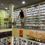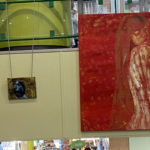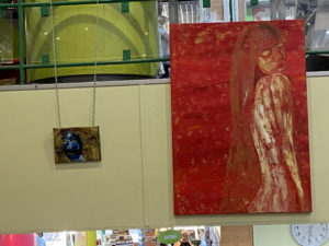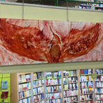 C’était un bon moyen de poser mes toiles pour qu’elles soient entrevues, entr’aperçues par un maximum de monde. C’est la première fois que j’expose dans un lieu aussi passager où les tableaux ne prennent pas toute la place. Je trouve beau que mes toiles se fondent parmi les livres.