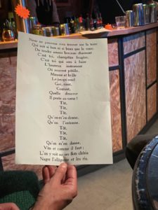 Le comédien interagit avec le public en l’interrogeant tout en lui donnant des poèmes et des images qui illustrent ses propos. Barthélémy Goutet propose également aux spectateurs une dégustation des différents cocktails préparés par Jonathan Scialom. Ce dernier offre au public une véritable démonstration de Flair Bartending (jonglage avec des bouteilles, des shakers et des verres afin de réaliser des cocktails).