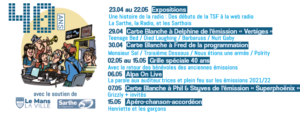 Un groupe de bénévoles de la station a concocté le programme des 40 ans, en lien avec l’équipe de professionnels de la radio. Depuis le 23 avril, et jusqu’au 22 mai 2022, le cinéma Les Cinéastes accueille deux expositions : « Une histoire de la radio » et « La Sarthe, la Radio et les Sarthois ». Le public pourra voir l’évolution de ce média et son rôle majeur dans l’Histoire.