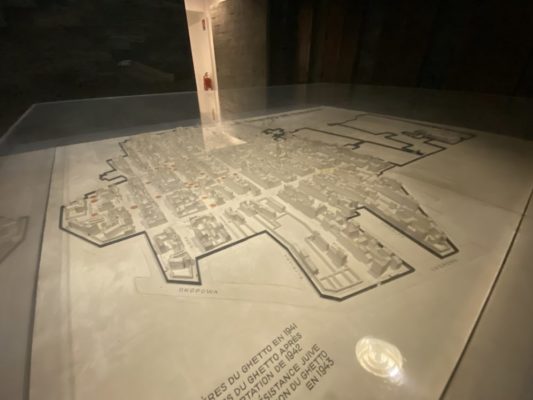 Confectionnée par deux rescapés Juifs, cette maquette du ghetto de Varsovie est saisissante. Il s’agissait du plus grand ghetto de Juifs de l’Europe, emprisonnant au total plus de 380 000 personnes. Le regard des visiteurs se perd parmi les rues et les artères de papier, non sans un quelque malaise et une certaine boule au ventre.