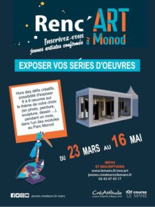 RENC’ART à Monod #2, exposition au parc Monod (Le Mans) et en ligne du lundi 21 mars au samedi 14 mai 2022. Inscriptions ici.