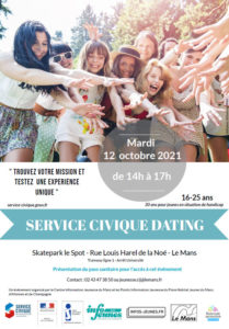Mardi 12 octobre 2021, au Mans, la 4e édition du service civique dating donnera l’occasion aux jeunes de 16 à 25 ans de rencontrer des structures à la recherche de leur prochain service civique, de passer des entretiens et de déposer des candidatures.