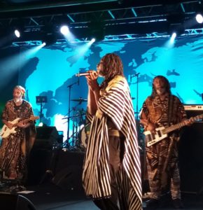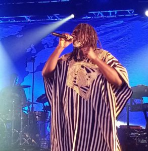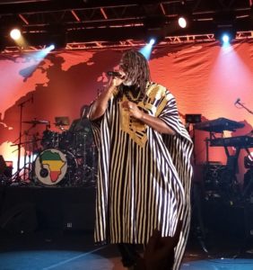 Vêtu d’un boubou et armé d’un bâton de pèlerin, le chanteur de 51 ans était soutenu par des musiciens hors-pair (bassistes, guitariste, batteur, claviériste) et deux danseuses-choristes. Devant 1 200 spectateurs, Tiken Jah Fakoly a mis l’ambiance en donnant beaucoup de mouvement. Pour le plus grand bonheur des fans de la première heure, il a joué des titres phare de ses anciens albums tout en faisant la part belle à son dernier opus en interprétant, entre autre, Ça vole, We love Africa, ou encore, Dieu nous attend. Une des choristes a fait sensation sur le devant de la scène avec une courte chorégraphie de danse traditionnelle africaine.